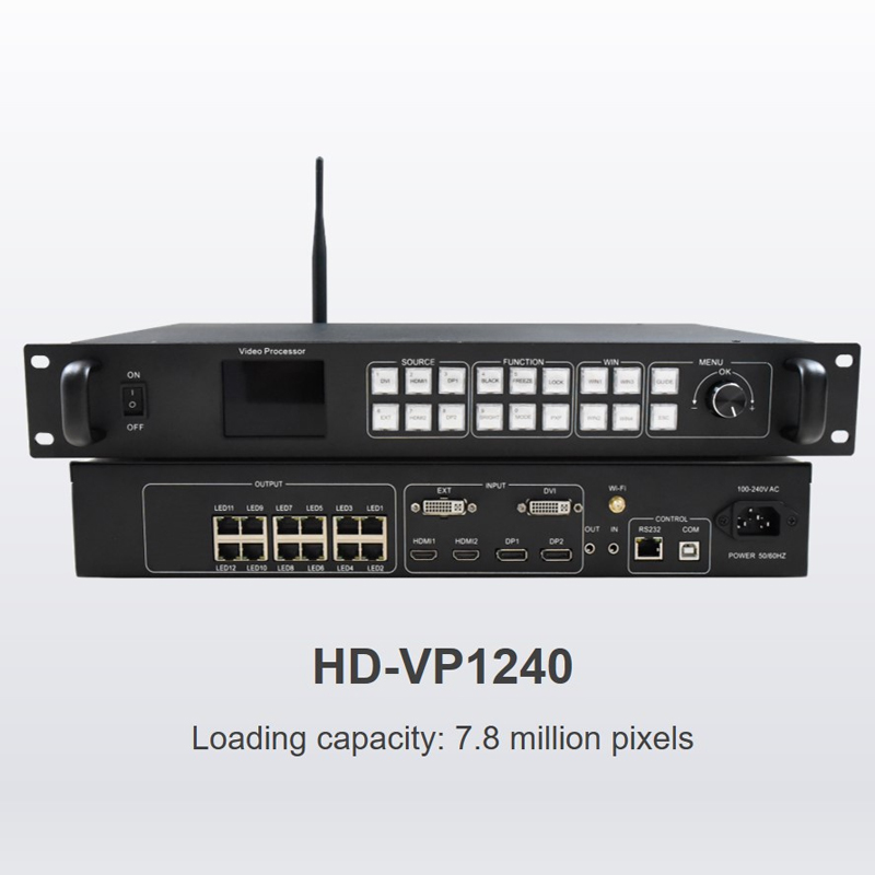 Huidu HD-VP1240 is a four windows display and 12 lines Gigabit Ethernet ouput LED video processor, the loading capacity is 7.8 million pixles, support 6 signal input and can swithing arbitrary, comes with Wi-Fi funciton, support mobile APP wireless control.